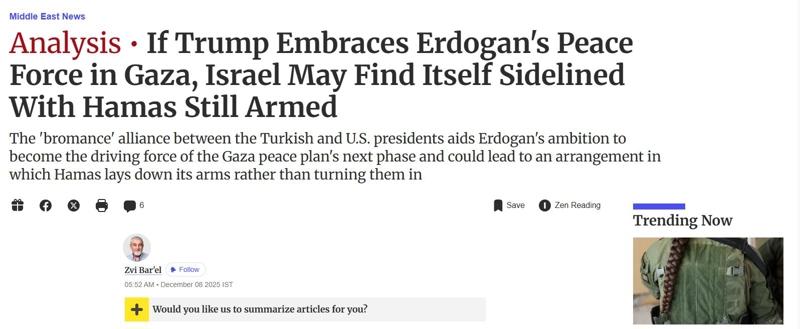 "Trump, Gazze'de Erdoğan'ın Barış Gücü'nü desteklerse İsrail kendini kenarda bulabilir" başlığıyla bir analiz kalem alan İsrail basını, Türkiye'nin Uluslararası Barış Gücü'nde yer almasının yen bir dönüm noktası olacağını yazdı.
