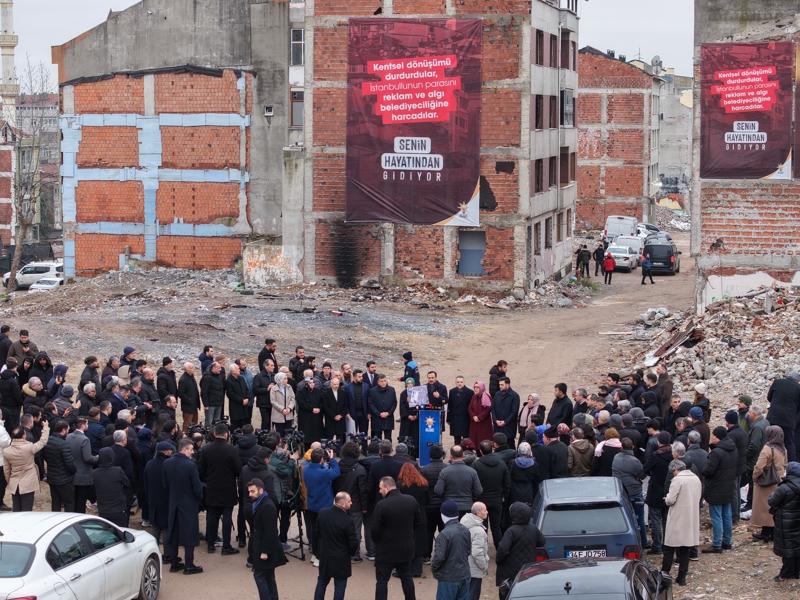 Türkiye'nin çok büyük bir deprem felaketiyle karşı karşıya kaldığını hatırlatan Özdemir, "11 ilde milyonlarca vatandaşımız evsiz kaldı ve on binlerce vatandaşımız hayatını kaybetti. 2023 yılından bugüne kadar hamdolsun milletimize vermiş olduğumuz sözü tuttuk ve 455 bin konutu deprem bölgesinde vatandaşlarımıza teslim ettik. Cumhuriyet Halk Partisi'nin genel başkanı '3 yılda ancak bitirebildiler' gibi maalesef talihsiz bir açıklama yaptı. Bu kadar büyük bir yapıyı altyapısı olmayan yerlere Adıyaman'da dağ başına İndire'ye hem altyapı götürdük hem konutları yaptık. Ama siz bakın tam 3 yıllık depremin 2 katı, 6 yıllık süre içerisinde şehrin göbeğinde, şehrin merkezinde altyapının her şeyin geldiği bir yerde hazır olan konutlara bakın. Size 'yerinden vatandaşları çıkartın. Başka bir yere götürün kiralık konutlara yerleştirin. Vatandaşımız ekstra kirayı ücreti ödesin' demiyoruz. 'Hazır olan konutlara becerin de buradaki vatandaşlarımızı taşıyın ve buradaki büyük alanı yine 100 dönümlük alanı hemen ilçemizdeki başka riskli bölgedeki vatandaşlarımızı alarak buraya onlara yaptığınız konutlara onları yerleştirin' diyoruz. Ama 6 yıldır maalesef buradaki vatandaşlarımızı hazır olan konutlara yerleştirecek bir iradeyi ve beceriyi maalesef Cumhuriyet Halk Partili İstanbul Büyükşehir Belediyesi gösterememiş durumda. Şunu özellikle ifade etmek istiyoruz. Cumhuriyet Halk Partisi'nin İstanbul Büyükşehir Belediyesi kentsel dönüşüm bütçesini AK Parti dönemindeki bütçeyi tam yüzde 60 oranında aşağıya çekmiştir. Ve buradaki kaynağı da maalesef konutlar yapmak ve vatandaşların kentsel dönüşüm sürecini yürütmek için değil reklamı ayırarak reklam bütçesini buradan aldığı bütçeyle daha da yukarılara çekmiştir. Bizler AK Partili teşkilat mensupları olarak belediyelerimiz olarak kentsel dönüşüm seferberliğimizi hız kesmeden devam ettireceğiz. Ve özellikle burada bulunan mağdur olan vatandaşlarımızın hakkını hukukunu sonuna kadar korumaya devam edeceğiz. Bakın burada 400'ün üzerinde bina söz konusuydu. 200'ün üzerindeki binayı anca yıkabildiler. 200'ün üzerinde yine bina var olduğu yerde duruyor. Şunu da görüyoruz burada arkamızda içerisi boşaltılmış; tamamen elektriği, suyu, doğalgazı kesilmiş yıkılmayı bekleyen ama beceriksiz İBB yönetimi tarafından yıkımı dahi becerilemeyen bir durumda. Bu metruk binalarda her türlü suç ve her türlü kötü fiil işlenmeye devam etmekte" diye konuştu