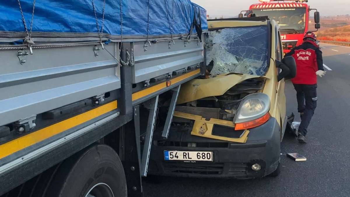 İstanbul'dan İzmir istikametine seyreden ve sürücüsünün kimliği henüz öğrenilemeyen 54 RL 680 plakalı minibüs, otoyolun Altıeylül ilçesi Karakol Mahallesi yakınlarında önünde seyreden tıra çarptı.