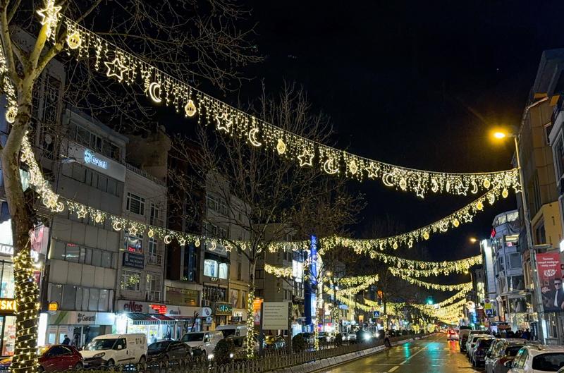 Direkler arasına asılan hilal ve yıldız motiflerinin akşam saatlerinde ışıklarının yakılmasıyla caddede ramazan atmosferi oluşturuldu.
