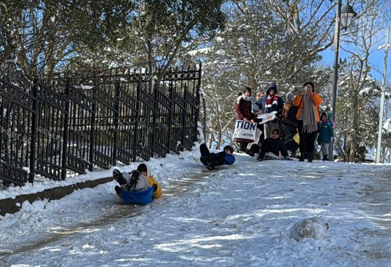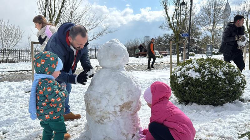 Beyaza bürünen Çamlıca Tepesi'ne gelerek vakit geçiren çocuklar, naylon poşetlerle karda kayarak eğlenirken, bazıları da aileleriyle kardan adam yaptı.
