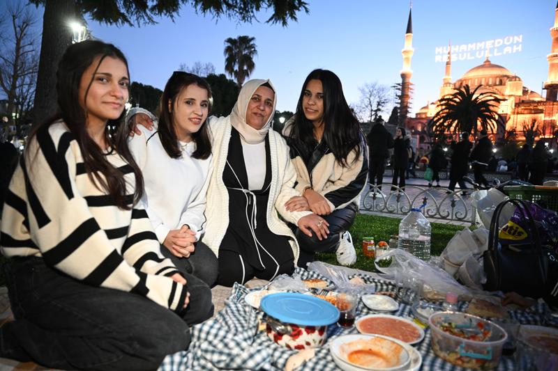 Tarihi yarımadada Sultanahmet Meydanı'nda da bir araya gelen yerli ve yabancı turistler, ramazanın ilk iftar saatini bekledi.