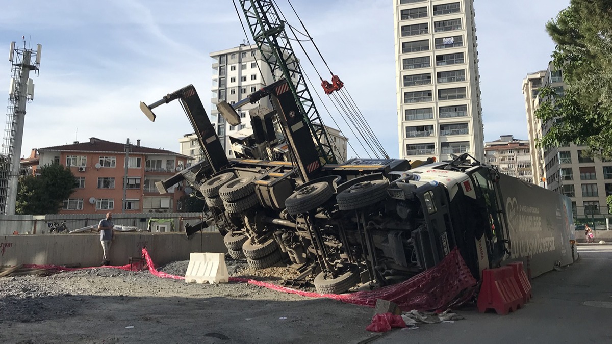 Göztepe Mahallesi Hamit Oskay Sokak'taki M12 Göztepe-Ümraniye Metro Hattı şantiyesinde çalışan kamyon üstü vinç, alandan iş makinesi çıkarırken devrildi.