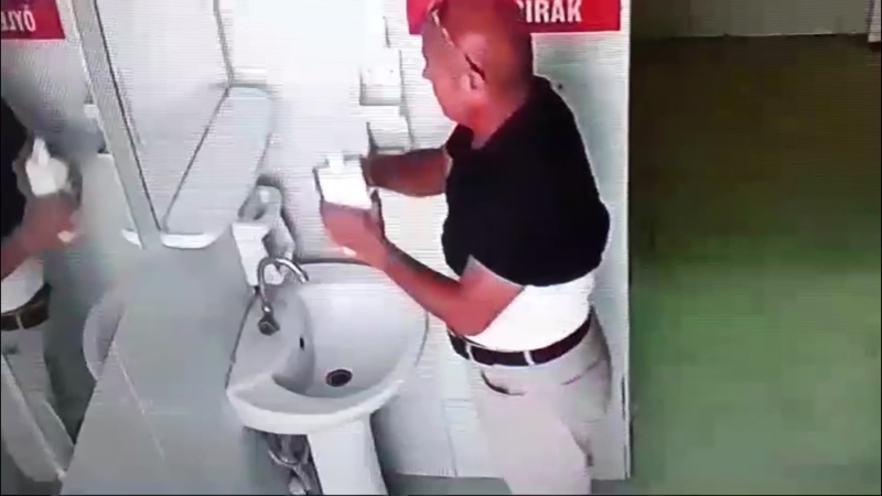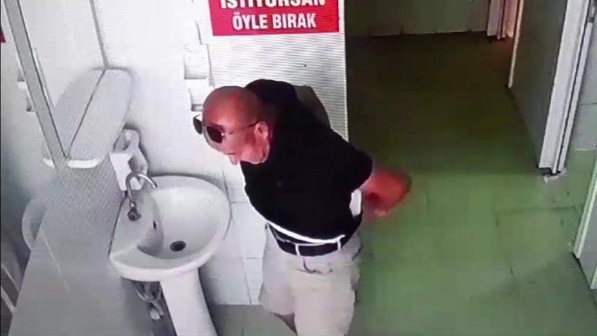 Tuvalette ellerini yıkayan kişi, daha sonra da duvarda asılı olan sıvı sabunluğu beline sokup elbisesiyle kapattı. Ardından da dışarı çıkan şüpheli otomobiliyle bölgeden uzaklaştı.