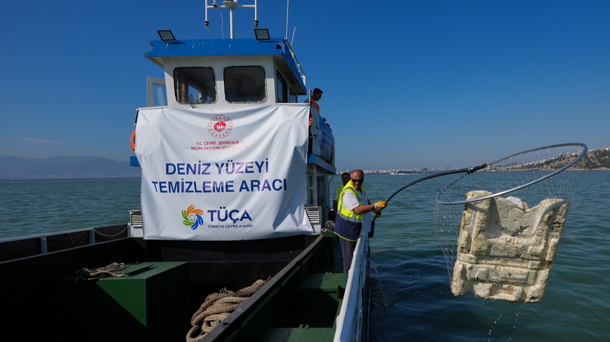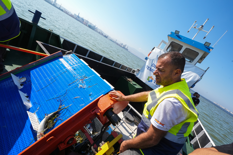 İzmir Körfezi'nde çalışmalara başlayan deniz süpürgesi olarak tabir edilen gemi, katı atık, ölü balıklar, plastik, ambalaj atıkları, balık ağları ve diğer zararlı materyalleri toplayarak geri dönüşüm için ayrıştırıyor.
