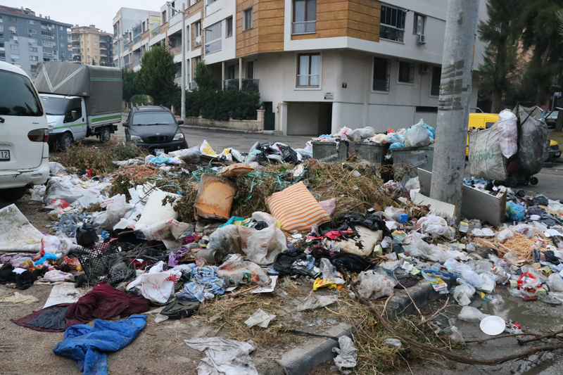 Buca Belediyesindeki grevin ardından çöp toplama aralığının uzaması nedeniyle Seyhan Mahallesi'nde çöp kutuları doldu, çöp yığınları oluşmaya başladı.