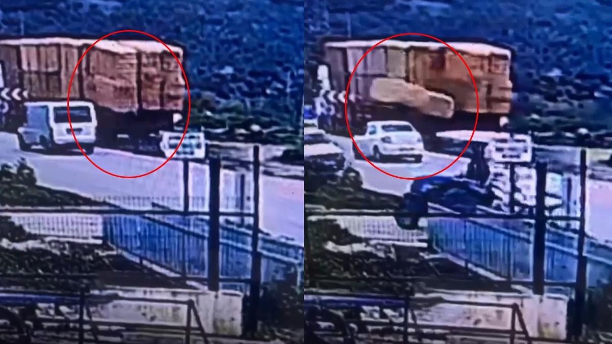 Çevredeki bir güvenlik kamerası olay anını kaydetti. Görüntülerde, Avcı'nın yol kenarında yürüdüğü sırada yanından geçen tırdaki balyaların üzerine düşmesi ve balyaların altında kalması yer aldı.