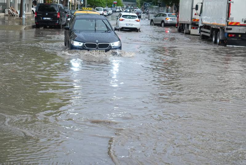 Trafik yoğunluğunun oluştuğu kentte araçlar su birikintileri nedeniyle ilerlemekte zorlandı.