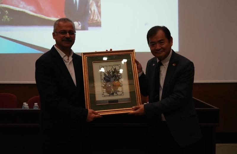Program sonunda Fakülte Dekanı Prof. Dr. Murat Lüy ile İnşaat Mühendisliği Bölüm Başkanı Prof. Dr. Osman Yıldız, Moriwaki'ye belge ve hediye takdim etti.