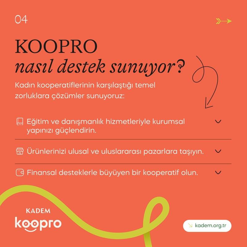 KooPro, kadın kooperatiflerine ürün danışmanlığı ve sertifikasyon, alıcı ve satıcı firmalarla işbirliği, ortak pazarlama faaliyetleri, kurumsallaşma süreçleri için eğitimler, hibeler ve dayanışma etkinlikleri gibi geniş bir yelpazede destek sağlıyor. Pilotlama aşamasında 10 kooperatifi, yaygınlaştırma aşamasında ise Türkiye genelinde 50'yi aşkın kooperatifi kapsayacak şekilde tasarlanan proje, kadın kooperatiflerinin sürdürülebilir iş modelleri geliştirmesine de öncülük etmeyi planlıyor.