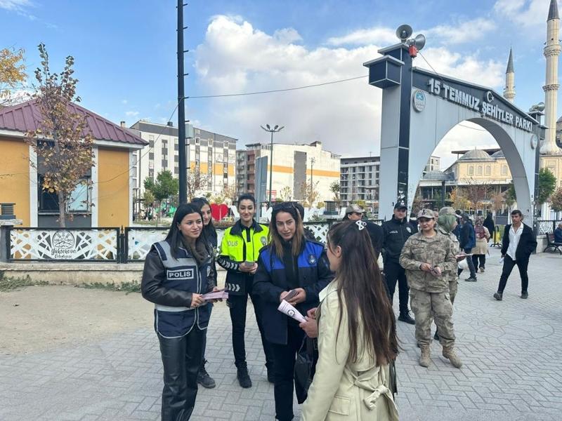 25 Kasım Kadına Yönelik Şiddete Karşı Uluslararası Mücadele Günü dolayısıyla, Yüksekova'da İlçe Emniyet Müdürlüğü, İlçe Jandarma Komutanlığı ve belediye zabıta birimlerinin tüm kadın görevlileri, ilçede farkındalık oluşturmak amacıyla sahaya inerek kapsamlı bir bilgilendirme çalışması gerçekleştirdi.