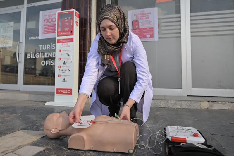 Ulus Meydanı'na konumlandırılan cihaz hakkında bilgi veren Bulut, OED'nin ani kalp durması durumlarında kalp ritmini analiz eden ve ihtiyaç halinde otomatik olarak şok verebilen taşınabilir bir cihaz olduğunu belirtti.