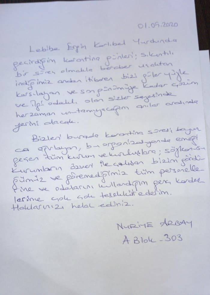 Ordu Üniversitesi Cumhuriyet Yerleşkesi'ndeki Lebibe Ergin Karlıbel Öğrenci Yurdu'ndan sabah saatlerinde ayrılan Nuriye Arbay, geride bıraktığı mektupta, karantina günlerinde yaşadıklarını anlattı.