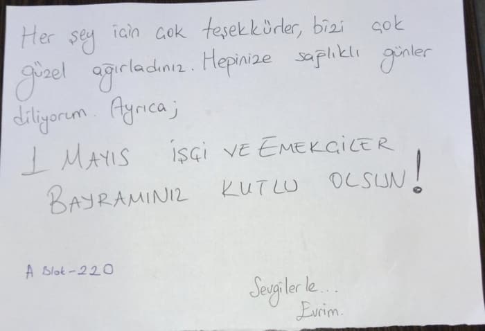 Görevlilerin sabah akşam kendileri için yorulmak nedir bilmeden uğraştıklarının altını çizen Koç, "Bu topraklarda insanlığın hala ölmediğine dair umutlarımı yeşerttiniz. Burada ailemden uzakta bana aile oldunuz. Sizlere ne kadar teşekkür etsem az. Sağlıcakla kalın." ifadesini kullandı.