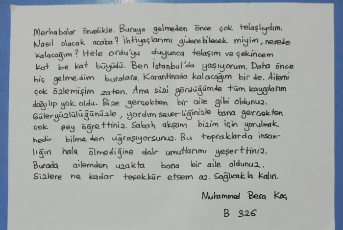 Mektubunda soyadını belirtmeyen Zeynep ise "İnsan hiç karantina süresi uzasın ister mi? Ama Türkiye'deysen istiyormuş. Canım ülkem yine beni şaşırtmadı ve vatandaşlarına olan sadakatini gösterdi. Emeği geçen herkese teşekkür ediyorum." görüşlerini aktardı.