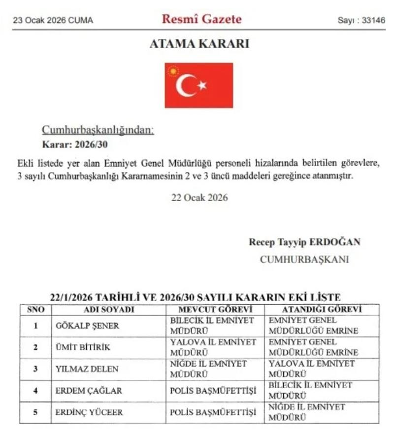 Karara göre Bilecik İl Emniyet Müdürü Gökalp Şener ve Yalova İl Emniyet Müdürü Ümit Bitirik Emniyet Genel Müdürlüğü Emrine alındı. Niğde İl Emniyet Müdürü Yılmaz Delen Yalova İl Emniyet Müdürlüğü'ne, Polis Başmüfettişi Erdem Çağlar Bilecik İl Emniyet Müdürlüğü'ne ve Polis Başmüfettişi Erdinç Yüceer Niğde İl Emniyet Müdürlüğü'ne atandı.