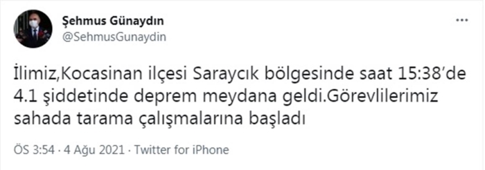 Kayseri Valisi Şehmus Günaydın, sosyal medya hesabından yaptığı açıklamada, "İlimiz, Kocasinan ilçesi Saraycık bölgesinde saat 15:38'de 4.1 şiddetinde deprem meydana geldi. Görevlilerimiz sahada tarama çalışmalarına başladı" dedi.