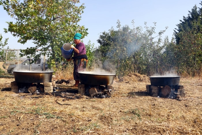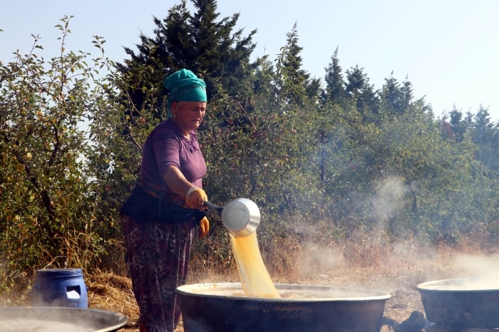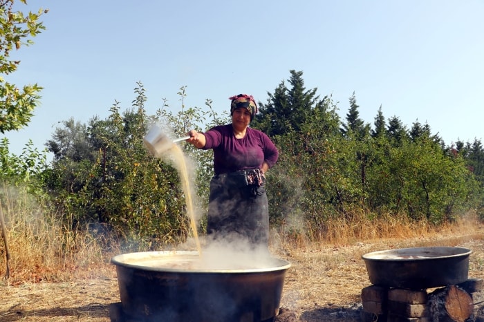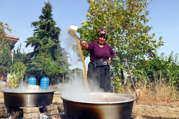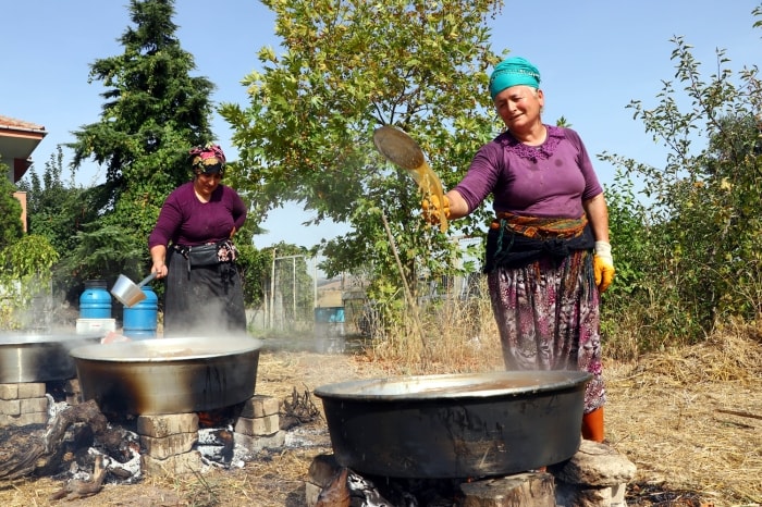 Kadınlar, Trakya'nın vazgeçilmez tatları arasında yer alan pekmez yapımı için mahallelerde imece usulüyle çalışıyor.