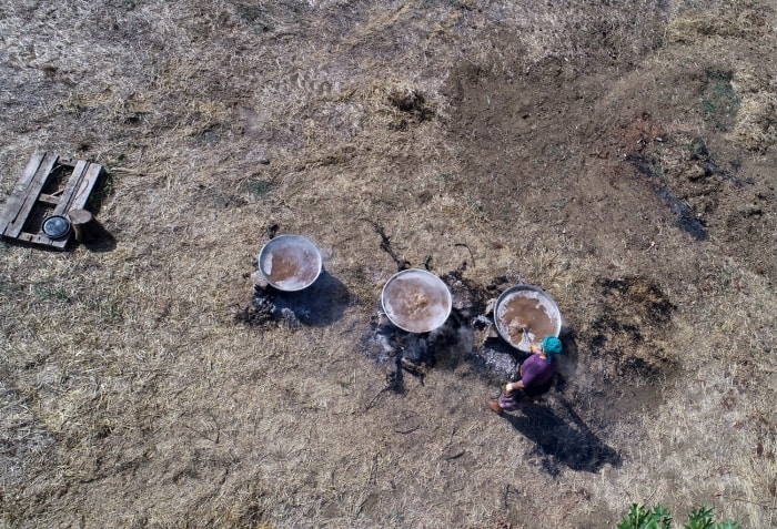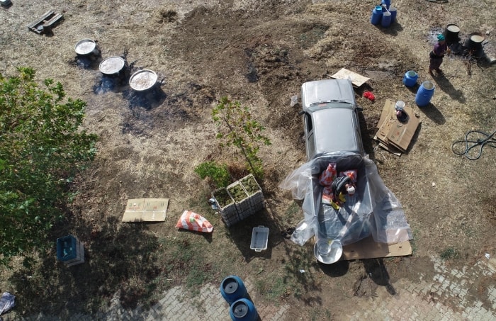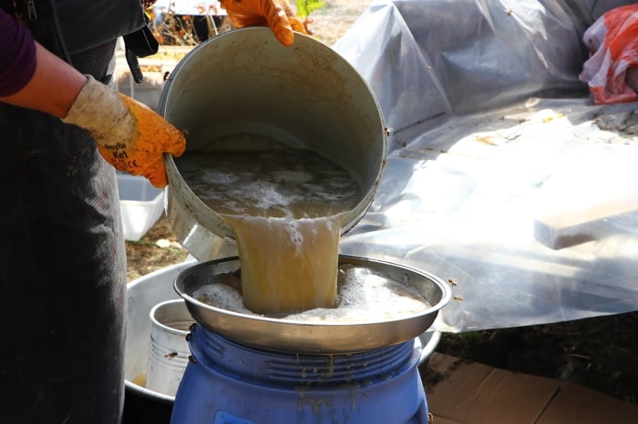 Toplanan üzümler geleneksel yöntemlerle sıkıldıktan sonra elde edilen su, odun ateşinde uzun süre kaynatılıp karıştırılarak pekmez haline dönüştürülüyor.