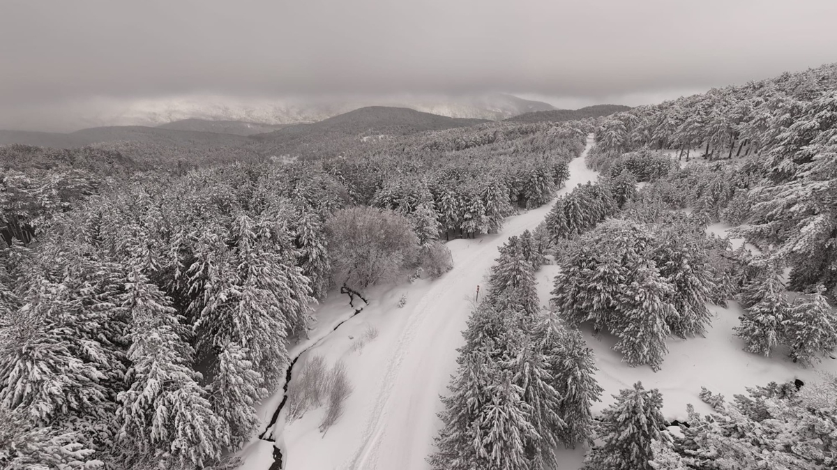 Kazdağları Milli Parkı'ndan yapılan açıklamaya göre, Edremit Körfezine bakan yüzünde etkili olan kar yağışının ardından oluşan beyaz manzara, milli park görevlilerince dron ile görüntülendi.