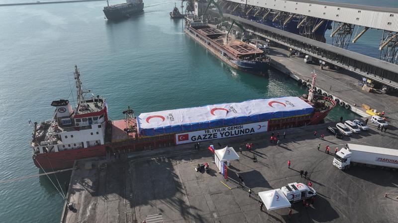 Gazze'ye gönderilmek üzere hazırlanan ve içerisinde yaklaşık bin 300 ton insani yardım malzemesi bulunan 'ANA-N' isimli 19. İyilik Gemisi, Mersin Uluslararası Limanı'ndan düzenlenen törenle uğurlandı.