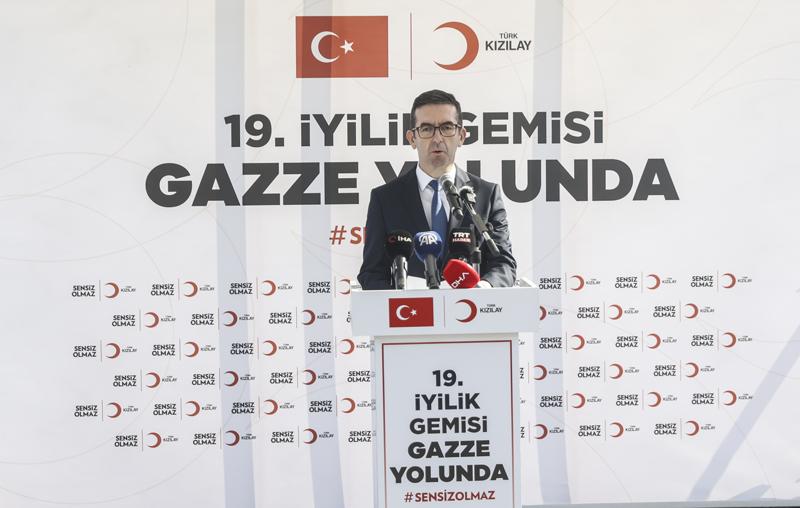 Törende konuşan Türk Kızılay Yönetim Kurulu Üyesi Kamil Karadeniz, Gazze'de yaşanan insani dramın tüm insanlığın vicdanında derin izler bıraktığını belirterek, "Türk Kızılay olarak, ülkemizin 19'uncu Gazze İyilik Gemisini, gönüllerde kandil yakma muradıyla, umutla, dua ile ve dayanışmayla yolcu ediyoruz. Gazze'de iki yılı aşkın süredir devam eden insani dram, yalnızca bir coğrafyanın değil, tüm insanlığın vicdanında derin izler bırakan ağır bir imtihandır. On binlerce çocuk ve kadın hayatını kaybetti. Yüz binlerce insan yaralandı. Evlerini, sevdiklerini, uzuvlarını kaybeden masumlar; bir lokma ekmeğe, bir yudum suya muhtaç bırakıldı" diye konuştu.