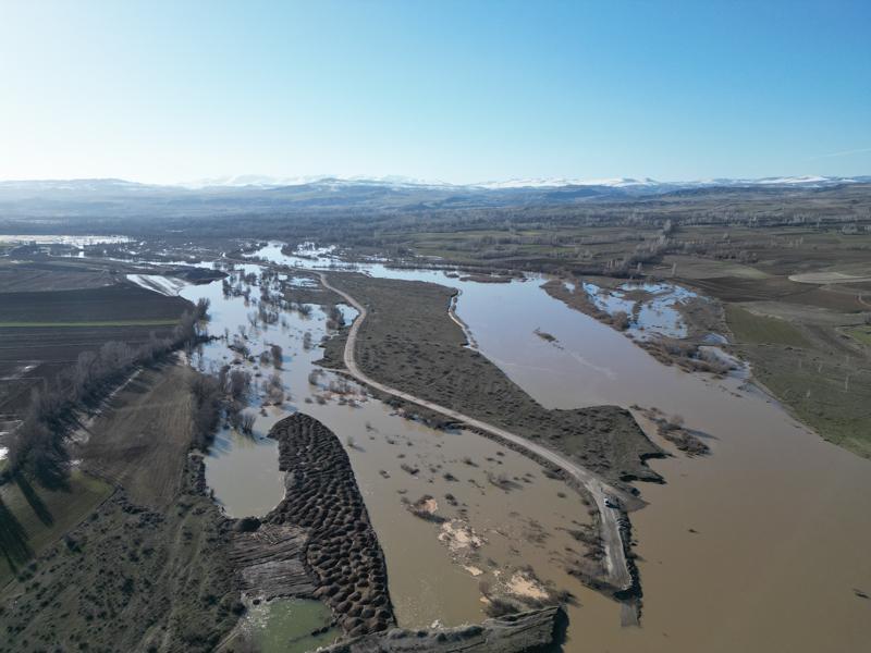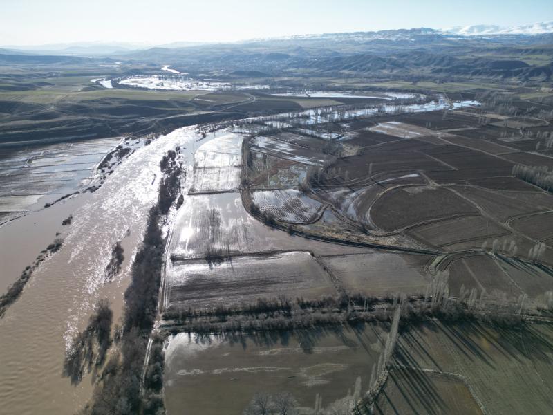 Görüntülerde, nehrin yatağından taşarak geniş bir alana yayılması ve tarım arazilerinde gölü andıran manzaralar oluşması yer alıyor.