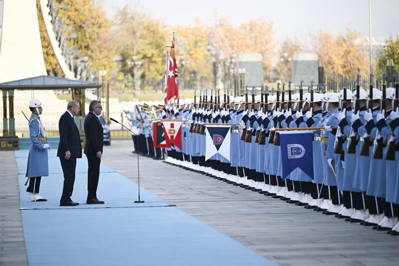 Erdoğan, Erhürman'ı Cumhurbaşkanlığı Külliyesi'nin ana giriş kapısında karşıladı. Cumhurbaşkanı Erdoğan ve Erhürman'ın tören alanındaki yerlerini almalarının ardından, 21 pare top atışı eşliğinde İstiklal Marşı çalındı.