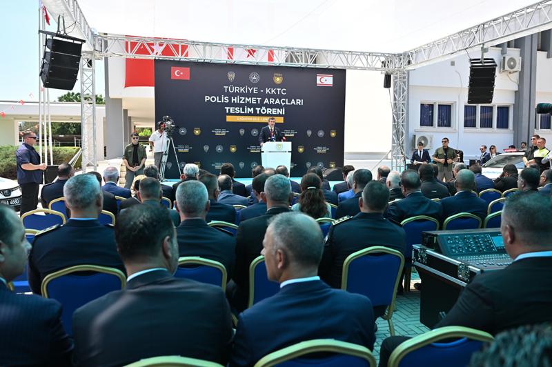 "Her biri sahada doğrudan karşılığı olan bu yatırımlar, Kıbrıs Türkü'nün güvenliğine, refahına ve kurumsal kapasitesine katkı sunmaktadır. Bugün burada Kuzey Kıbrıs Türk Cumhuriyeti'ne kamu güvenliği alanında önemli güç kazandırıyoruz. Türkiye ile KKTC arasındaki işbirliği ruhuyla 29 yeni aracı hizmete alıyoruz. Bunlardan 24'ü hizmet aracı şeklinde, 5'i ise itfaiye aracı olmak üzere bugün 29 aracın teslimini yapıyoruz. Polis hizmet aracı olarak hibe ettiğimiz 24 araçtan 12'sini Mali Destek Programı kapsamında temin ettik. 12'sini ise İçişleri Bakanımız Sayın Ali Yerlikaya, Türkiye'deki Emniyet Teşkilatının imkanlarıyla temin etti. Bugün gelemedi. Bu vesileyle sizlere selamlarını iletiyorum. Sayın Bakan'a, İçişleri Bakanlığımıza, Emniyet Genel Müdürlüğümüze çok teşekkür ediyoruz. İki emniyet teşkilatının kardeşliğinin de güzel nişanesi oldu bu."
