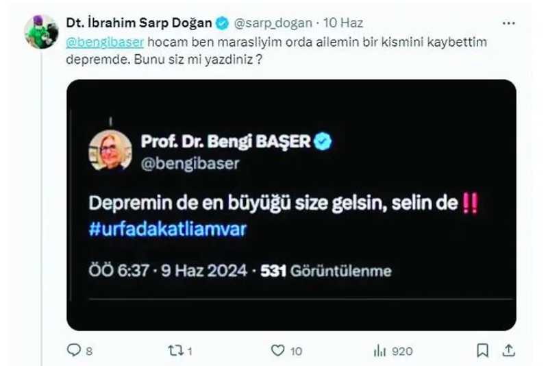Başer, deprem ve sel felaketlerinde onlarca insanın hayatını kaybettiği Şanlıurfa ile ilgili, "Depremin de en büyüğü size gelsin, Selin de!" dedi. Bir doktorun "Hocam ben Maraşlıyım orda ailemin bir kısmını kaybettim depremde. Bunu siz mi yazdınız? sorusunu üzerine Başer şu karşılığı verdi: "Ben de depremin 3. Günü Hatay'a desteğe giden ekipteydim. İstanbul depremini de yaşadım. Bu zulmü yapanların en kötü tecrübelerle sınanmasını dilemekten başka çare bırakmıyorlar bize. Depremde köpeklerden destek alırken insanlar, sesler çıkmıyordu ama bu kötülüğü yapanların Allah'ın zulmünü yaşamalarını tüm gönlümle diliyorum. Elbette herkes için dileyecek kadar insanlığımı yitirmedim. İnsan olan her canlının acısını hisseder üstelik. İyi bilirler kelimelerle oynamayı ve fırsatı bulunca ahlaksızca taşa tutmuşlar. Bunların topu benim kadar insanlığa katkı sunmamıştır. Evet bu zalimlerin Allah'ın sopasına maruz kalmasını tüm yüreğimle istiyorum."