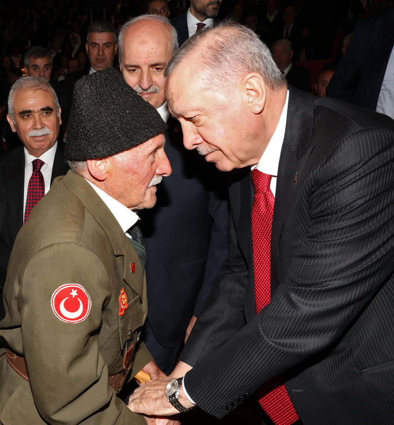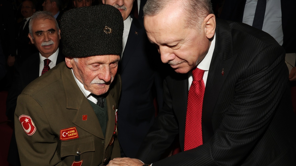 Cumhurbaşkanı Erdoğan, Kore Gazisi Pirağa Uzun ile yakından ilgilenerek selamlaştı.