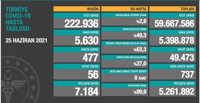 Buna göre, Türkiye'de son 24 saatte 222 bin 936 Kovid-19 testi yapıldı, 5 bin 630 kişinin testi pozitif çıktı, 56 kişi hayatını kaybetti, hasta sayısı ise 477 olarak kayıtlarda yer aldı.