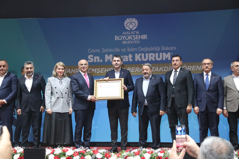 Bakan Kurum'a konuşmasının ardından Malatya Büyükşehir Belediye Meclisi tarafından oy birliği ile kabul edilen 'Fahri Hemşehrilik Beratı' takdim edildi.