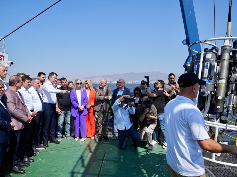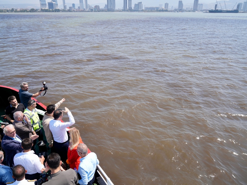 Konuşmanın ardından Kurum ve beraberindekiler kirliliğin yoğunlaştığı Bayraklı açıklarında inceleme yaptı.