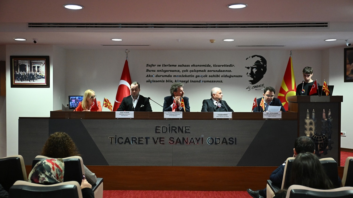 Edirne Ticaret ve Sanayi Odası (ETSO), Kuzey Makedonya Ankara Büyükelçiliği ve Edirne Fahri Konsolosluğu ortaklığında ETSO'da düzenlenen programda konuşan Kuzey Makedonya'nın Türkiye Büyükelçisi Jovan Manasijevski, Edirne ile ülkeleri arasındaki ticari işbirliğinin geliştirilmesi için çalıştıklarını söyledi.