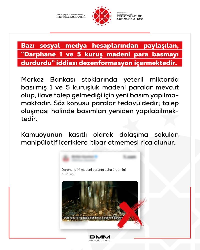 İletişim Başkanlığı Dezenformasyonla Mücadele Merkezi (DMM) Bazı sosyal medya hesaplarından paylaşılan, "Darphane 1 ve 5 kuruş madeni para basmayı durdurdu" iddiasının dezenformasyon olduğunu açıkladı.