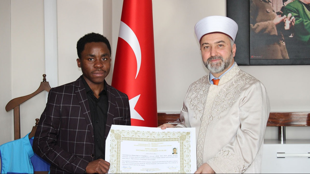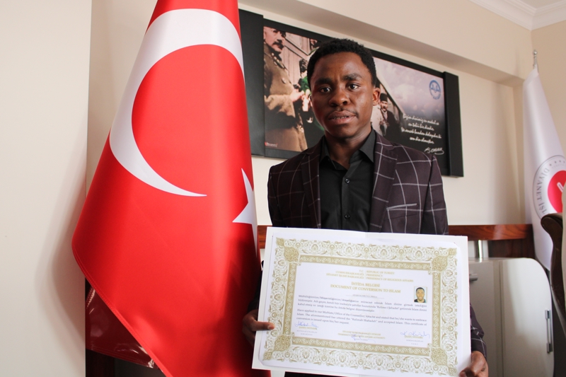 Mbala, bir süre sonra arkadaşlarına ve hocalarına Müslüman olmak istediğini söyledi. Mbala, talebi üzerine bugün İl Müftülüğüne götürüldü. Mbala, İl Müftülüğünde şehadet getirip Müslüman oldu. İl Müftüsü Şahin Yıldırım, Amado Kambungu Mbala'ya İslamiyet ile ilgili bilgiler vererek Kur'an-ı Kerim okudu. Okunan Kur'an-ı Kerim tilaveti sonrası Amado Kambungu Mbala, 'Ahmet' ismini aldı. Ahmet ismini alan Amado Kambungu Mbala, çok mutlu olduğunu belirterek, "Müslümanlık özel bir din. Bugün şehadet getirdim ve bu benim için çok çok önemli" dedi.