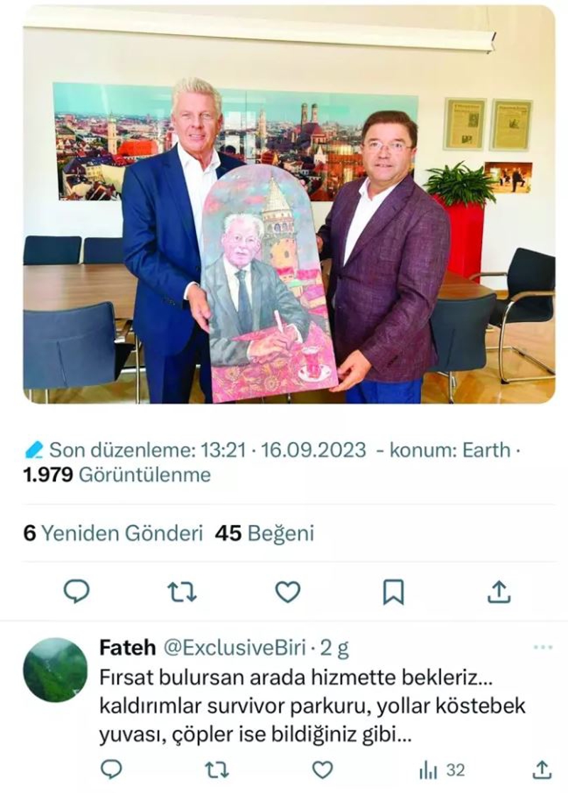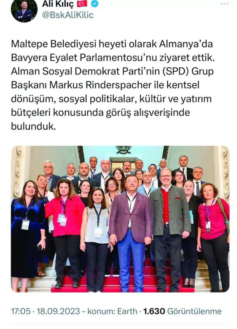 CHP'li Maltepe Belediye Başkanı Ali Kılıç, 30 birim müdürü ve başkan yardımcılarıyla bir haftalık Münih ziyareti gerçekleştirdi. Kalabalık heyetle yapılan ziyaretin, Münih'te düzenlenen ve her yıl binlerce turistin akınına uğrayan bira festivali Oktoberfest'e denk gelmesi dikkat çekti. 14 Eylül'de Münih'e giden Kılıç ve ekibi, önce Münih Belediye Başkanı Dieter Retier'i ziyaret ederek tablo hediye etti. Fotoğrafı sosyal medya hesabından paylaşan Kılıç'a bir vatandaş, "Fırsat bulursan arada hizmete bekleriz. Kaldırımlar Survivor parkuru, yollar köstebek yuvası, çöpler ise bildiğiniz gibi" yorumunu yaptı.