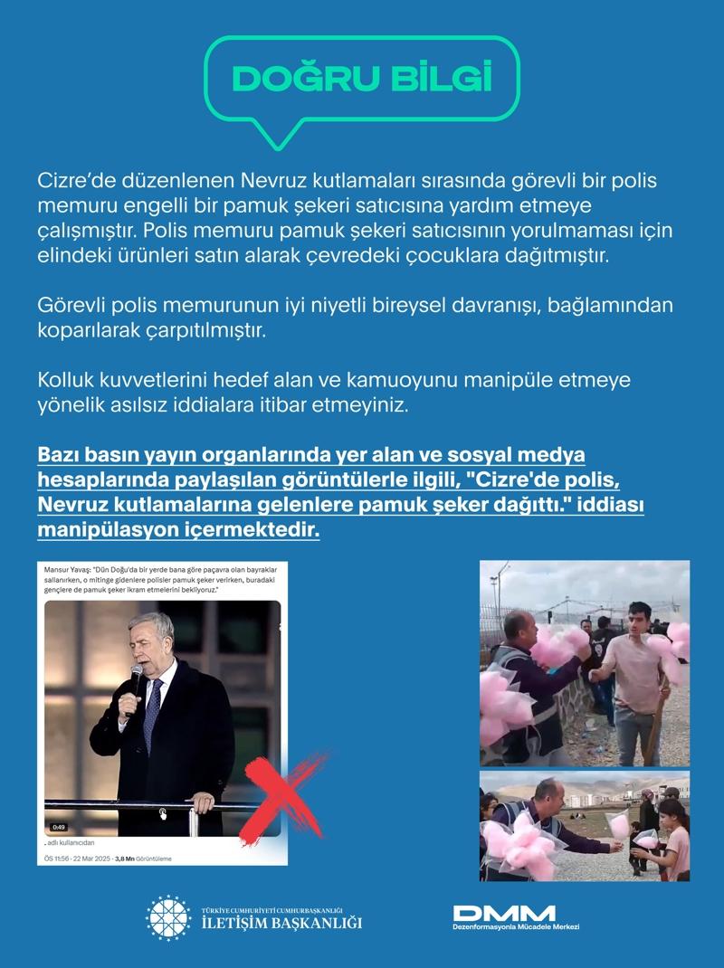 Dezenformasyonla mücadele Merkezi (DMM), "Cizre'de polis, Nevruz kutlamalarına gelenlere pamuk şeker dağıttı" yalanı hakkında açıklamada bulundu. Görüntülerin manipüle edildiğini bildiren DMM, görevli polis memurunun engelli bir pamuk şekeri satıcısına yardım etmeye çalıştığını açıkladı.