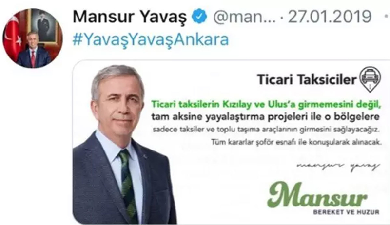 Yavaş, 2019 yılında verdiği "Ulus ve Kızılay araç trafiğine kapatılacak" sözünü de yerine getirmedi. Yavaş aynı projeyi "bu projenin benim için yeri ayrı" diyerek yeniden seçmenin önüne sundu.