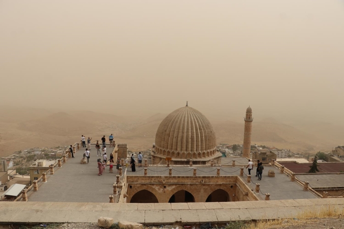 Toz bulutu ile kentin simge yapıları da farklı bir görünüm kazandı. Yerli ve yabancı turistler bu anı cep telefonuyla kaydetti.