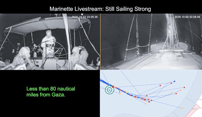 Küresel Sumud Filosu'na bağlı Marinette adlı gemi Gazze Şeridi'ne doğru seyrine devam ediyor. 24 TV canlı yayınına bağlanan Türk aktivist Ömer Faruk Narlı, 'Herhangi bir deniz aracı şu anda etrafımızda görmedik. Bizi engelleyemiyorlar. Başka bir rota takip ettik. Girit'ten bu yana dolayısıyla bizi pas geçti terörist İsrail askerleri' dedi.