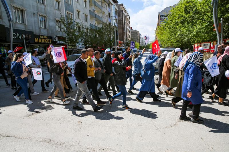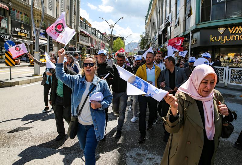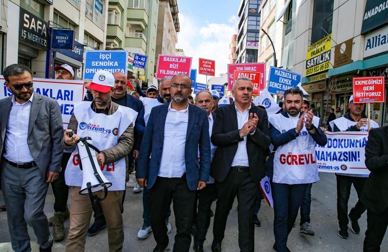 Düdük çalıp sloganlar atan işçiler ve sendika üyeleri, İpekyolu Belediyesi önüne kadar yürüdü.