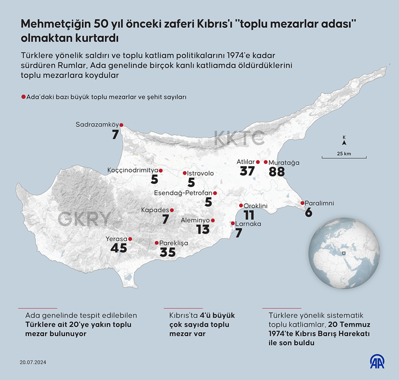 Türklere yönelik saldırı ve toplu katliam politikalarını 1974'e kadar sürdüren Rumlar, Ada genelinde birçok kanlı katliamda öldürdüklerini toplu mezarlara koydular.