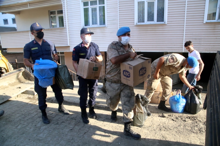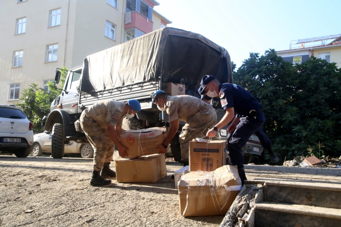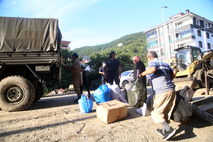 Sel felaketinin yaşandığı ilçede, AFAD Mobil Koordinasyon Merkezi'ne gelen talepler üzerine harekete geçen İl Jandarma Komutanlığı ekipleri, vatandaşların selde zarar gören eşyalarını istedikleri yere askeri araçla götürüyor.
