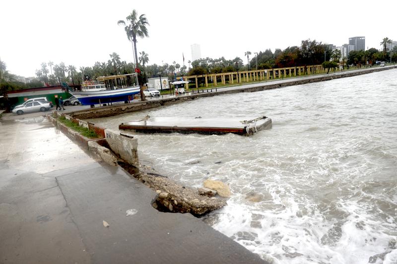 Rüzgar nedeniyle kıyısında dalgaların oluştuğu Mersin Balıkçı Barınağı'ndaki yüzen iskele ve bazı tekneler zarar gördü.