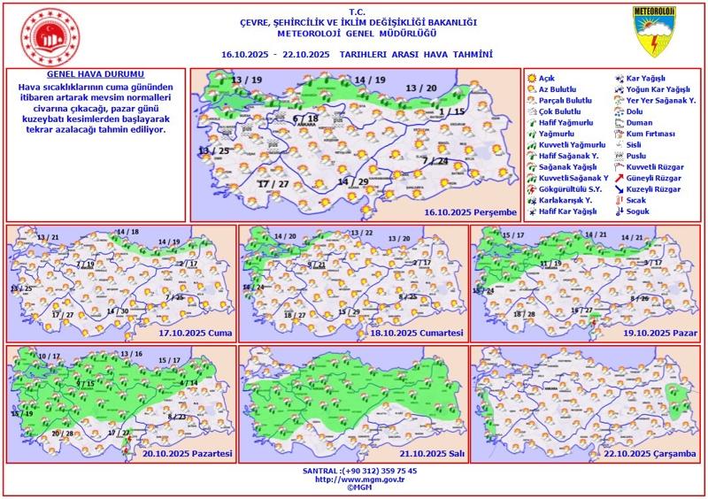 Meteoroloji Genel Müdürlüğü tarafından yapılan tahminlere göre: Ülkemizin kuzey, iç ve batı kesimleri parçalı yer yer çok bulutlu, Marmara'nın kuzeyi, Batı Karadeniz (Zonguldak ve Düzce haric), Orta ve Doğu Karadeniz kıyıları ile Artvin ve Bandırma çevrelerinin aralıklı yağmur ve sağanak yağışlı, diğer yerlerin az bulutlu ve açık geçeceği tahmin ediliyor. Sabah ve gece saatlerinde Marmara'nın güneyi, Ege ve Karadeniz'in iç kesimlerinde pus ve yer yer sis hadisesi bekleniyor.