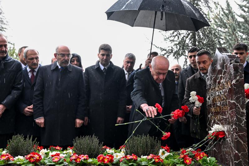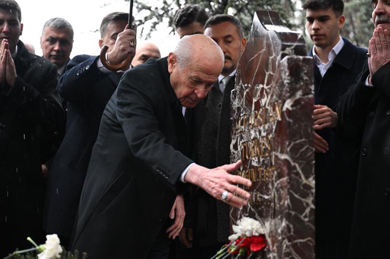 Kur'an-ı Kerim okunmasının ardından Bahçeli, Türkeş'in kabrine kırmızı ve beyaz karanfiller bıraktı, bakır ibrikle su döktü.