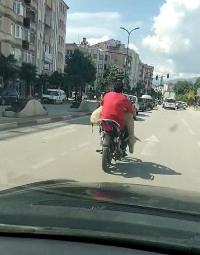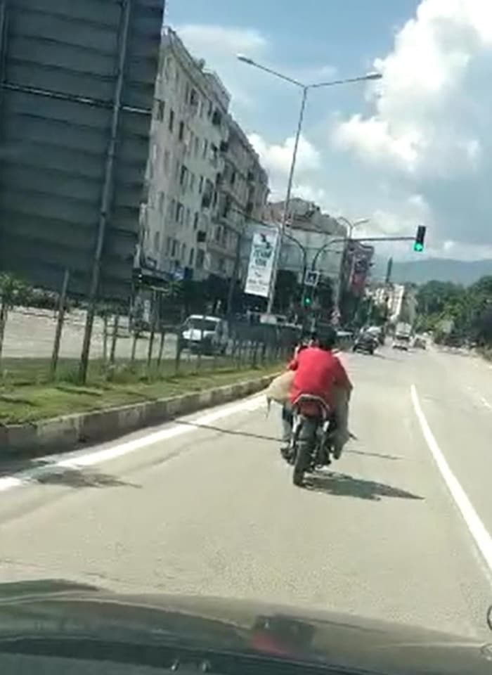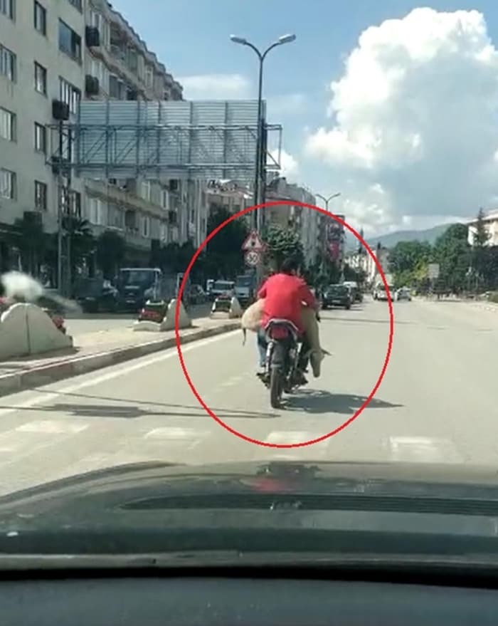 Bursa'nın İnegöl ilçesindeki Osmaniye Mahallesi, Ahmet Akyollu Caddesi üzerinde, seyir halindeki ismi henüz öğrenilemeyen motosiklet sürücüsü, küçükbaş hayvan taşırken cep telefonu kamerasıyla görüntülendi. Çevredekilere aldırmadan yoluna devam eden sürücü, görenleri hayrete düşürdü. Trafikte tehlikeli bir şekilde seyreden sürücü, küçükbaş hayvanı ile birlikte araçların arasından geçerek, yoluna devam etti. O anlar ise bir vatandaşın amatör kamerasına yansıdı.