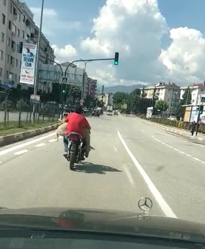 Bursa'nın İnegöl ilçesindeki Osmaniye Mahallesi, Ahmet Akyollu Caddesi üzerinde, seyir halindeki ismi henüz öğrenilemeyen motosiklet sürücüsü, küçükbaş hayvan taşırken cep telefonu kamerasıyla görüntülendi. Çevredekilere aldırmadan yoluna devam eden sürücü, görenleri hayrete düşürdü. Trafikte tehlikeli bir şekilde seyreden sürücü, küçükbaş hayvanı ile birlikte araçların arasından geçerek, yoluna devam etti. O anlar ise bir vatandaşın amatör kamerasına yansıdı.